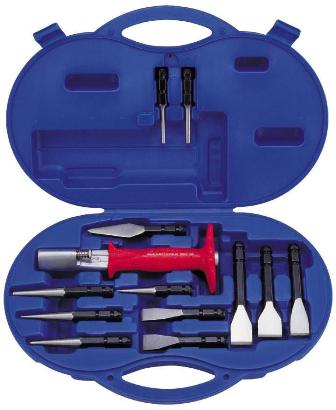 All Go Chisel & Punch Set Interchange - Shank: 13mm ( with 12 pcs Bits ) - Material: Main Handle: w/pvc red grip Chrome-Vanadium Chrome-Vanadium Bits - Contents: 5-Flat Chisels 13,16,19,22,25mm 1-Cape Chisel 6mm 2-Taper Punches ψ3,6mm 2-Pin Punches ψ5,6mm 2-Center Punches ψ3,5mm |