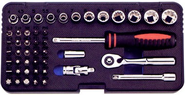 Contents: * 1pc - 1/4"DR.72T Flexible Ratchet Wrench Handle * 1pc - 1/4"DR.x75mm(L) Socket Extension Bar * 1pc - 1/4"DR. Bit Adaptor * 1pc - 1/4"DR. Sliding T-Bar * 1pc - 1/4"DR. Spinner Handle * 12pcs - 1/4"DR. Spline Socket 4-4.5-5-5.5-6-7-8-9-10-11-12-13mm * 30pcs - Power Bits, S2 H2-2.5-3-4-5-6 T9-10-15-20-25-27-30-40 SL3-4-5-6 PZ1-1-2-2-3-3 PH1-1-2-2-3-3 |